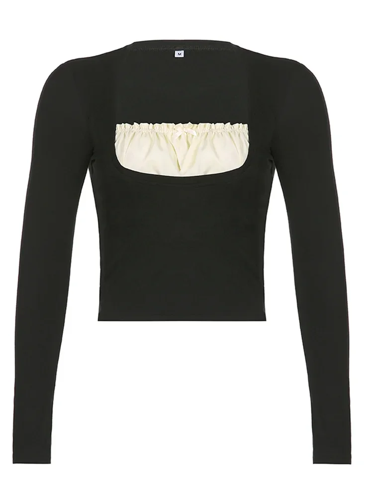 Women Shirts Fake-2-Piece Long Sleeve Square Neck Tops Autumn Gothic Grunge Y2K Aesthetic T-shirt Streetwear